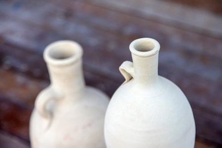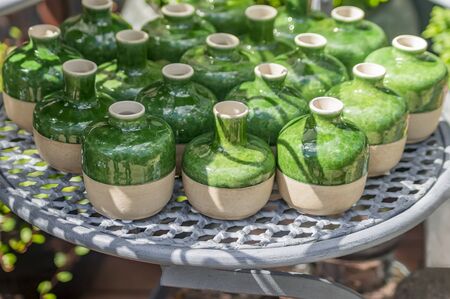 Vintage earthenware clay pots for wine and water containment used as decorative objects in a garden