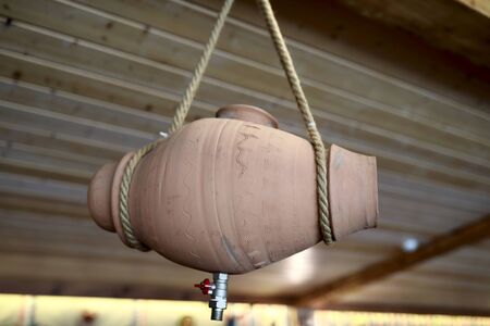 Wicker fence of thin rods with hanging old clay pot. Old clay Jug, ethnic ceramic pot at wattle fence.