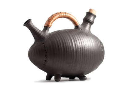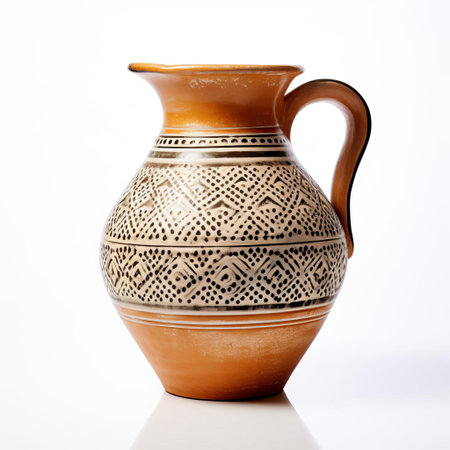 the earthenware jug sits elegantly against a pristine white background, showcasing its rustic charm and earthy tones, evoking a sense of traditional craftsmanship and vintage appeal, perfect for rustic home decor, country kitchens, and antique collectors. ai generated