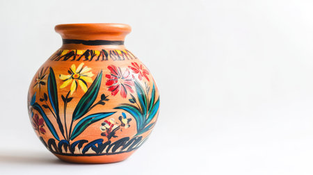 Empty ceramic brown flower and plant pot with colourful floral ornament isolated on white background with copy space.