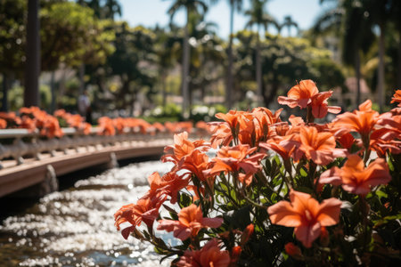 Vibrant Tropical Garden Featuring Lush Foliage and Colorful Flowers in Late Afternoon Light