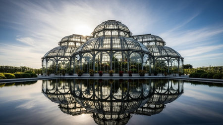 Tropical greenhouse. Lush greenhouse interior with vibrant plants lining a glossy green reflective pathway, natural light streaming through glass roof.