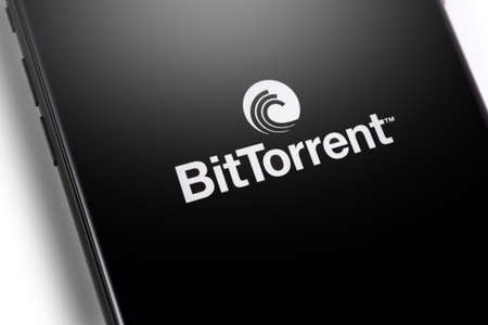 closeup smartphone with BitTorrent logo. Website of BitTorrent, a communication protocol for peer-to-peer file sharing (P2P). Moscow, Russia - March 26, 2019