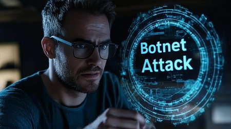 Cybersecurity Threats Businessman Analyzing Botnet Attack Through Holographic Interface.