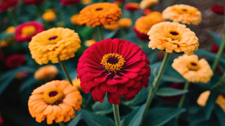 Colorful zinnia flowers blooming in the garden with soft focus.