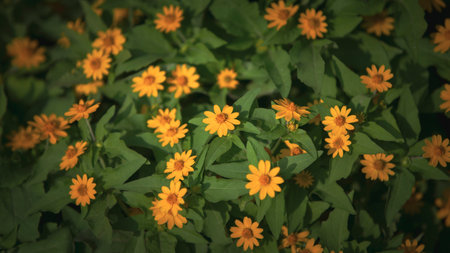 Little Tiny Small orange and white Flowers on dark green leaves Background Artistic Wallpaper Pattern .nature background