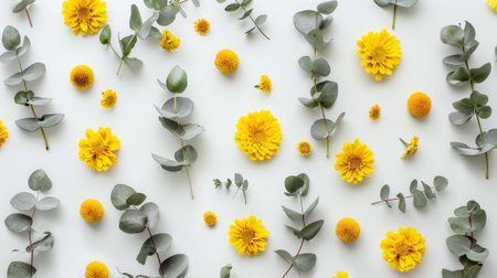 Flowers composition. Yellow flowers with eucalyptus leaves on white background. Flat lay, top view..