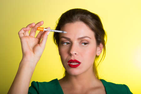 Young beautiful woman on white isolated background holds a syringe, plastic surgery, medicine.