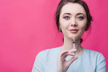Woman cosmetologist doctor with a syringe in hands on a pink background in the studio. The concept of cosmetology, medicine and beauty