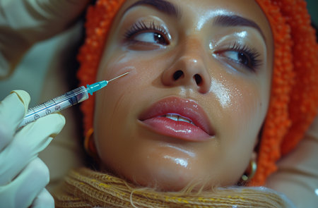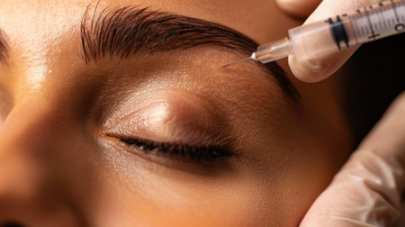 Close up view of cosmetic procedure, showcasing syringe being used near eyebrow area. focus is on skin texture and careful application of treatment, highlighting beauty and self care