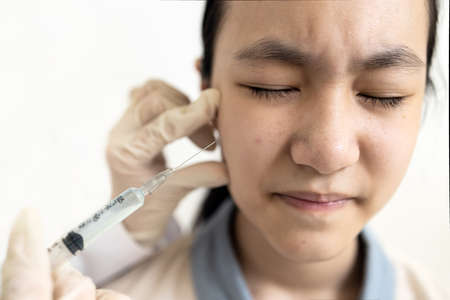 Acne injection syringe,face serum for sensitive skin,facial treatment for teenagers,infection,inflammation in the skin,against acne,red pimples on the cheeks,beauty injections,facial skin care concept