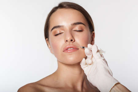 Young beautiful woman getting beauty injection for lip augmentation with hyaluronic acid isolated on white background