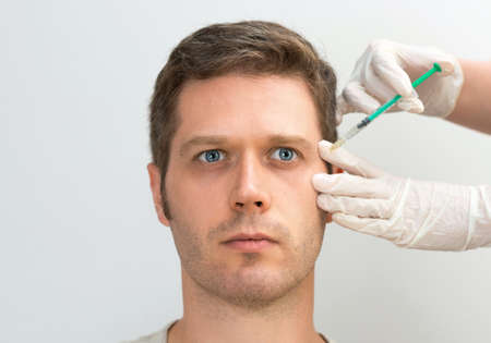 Male patient is given multiple injections into facial skin. Cosmetology for men concept