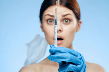 woman with a syringe in hand doing injections in the face on a blue background botox operation