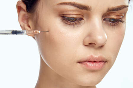 Aesthetic medicine. Beautiful woman face gets a beauty injection. Lifting and removal of facial wrinkles. Face contouring. Perfect face model on white background.