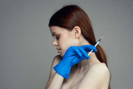 Beautiful young woman, syringe, gray background, medicine, plastic surgery.