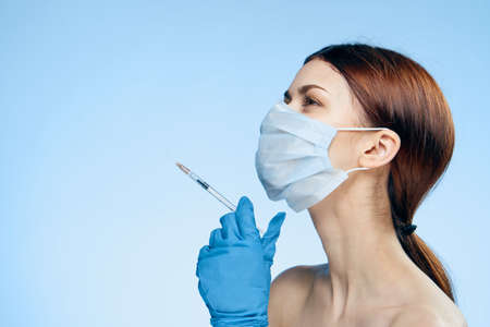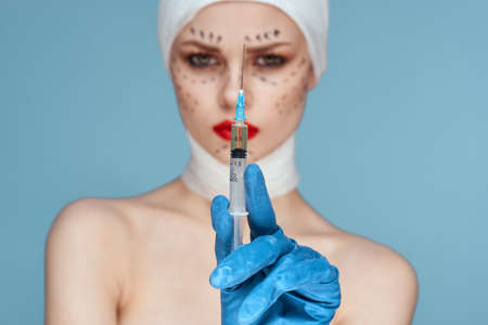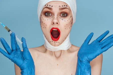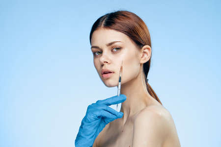 beautiful woman in blue gloves syringe in hands contour on the face lifting studio lifestyle