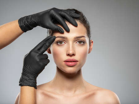 Face skin check before plastic surgery. Beautician touching woman face. Doctor checks a skin before plastic surgery. Beauty treatments. Plastic surgery doctor is touching face of a patient by hands