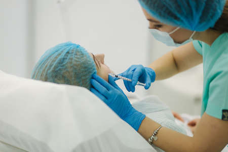 contour plastic. A cosmetologist injects a botulinum toxin to tighten and smooth out wrinkles on the skin of a female face