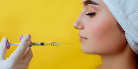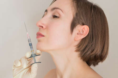 Beautiful woman face and beautician hands with syringe. Doctor makes cosmetic injection. Clean Beauty concept