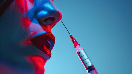 botox injection into natural human face with syringe on blue red neon background, space for text