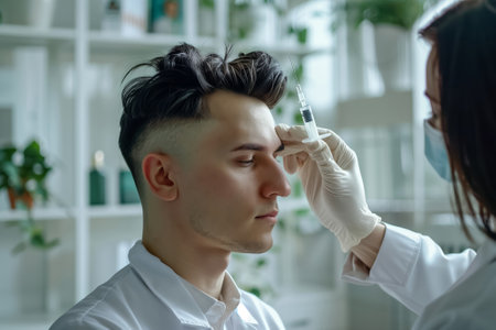 Procedure Plasmolifting injection. Young man will do PRP therapy for the face against wrinkles. Plasma injection into the skin of the patient's forehead. Generative ai.