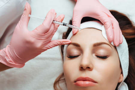 The doctor cosmetologist makes the Botulinotoxin injection procedure for tightening and smoothing wrinkles on the face skin of a beautiful, young woman in a beauty salon.Cosmetology skin care.