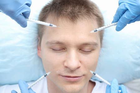 Handsome man is getting injection. Concept of aesthetic beauty. Place for your text.
