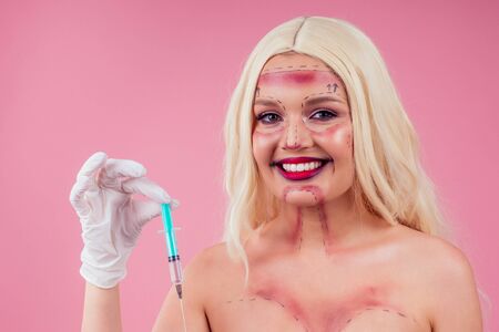 surgery victim beauty drawing line make up face female before operation syringe.halloween concept