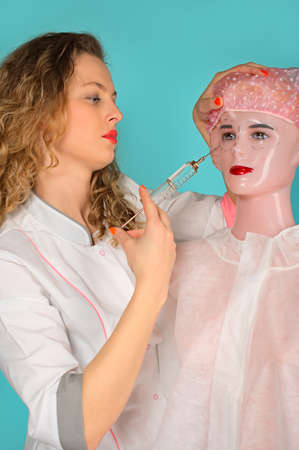 glamorous doctor makes plastic surgery on the face of a mannequin. turquoise background