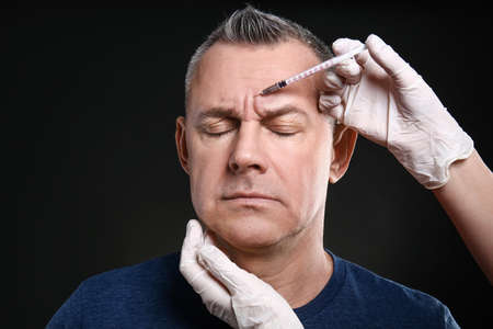 Dermal Filler injection. Middle-aged man receives dermal filler injection for reduction of forehead wrinkles—anti-aging concept.