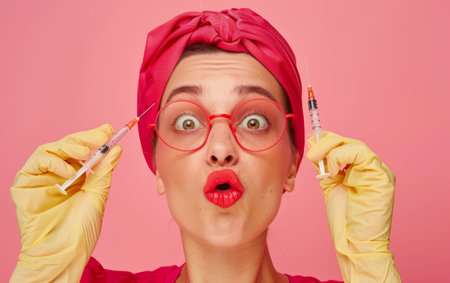 A woman humorously reacts to holding two cosmetic syringes, her wide-eyed expression and playful demeanor adding a comedic twist to beauty procedures
