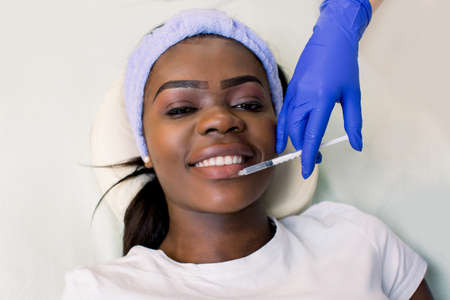 Beautiful young African woman gets cosmetic injection on her lips, isolated over light background. Doctor is making an injection in lips. Beauty Treatment