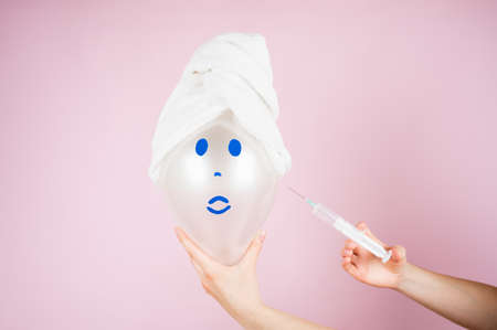 Concept with syringe and hand injecting a balloon. Non-invasive cosmetology concept.