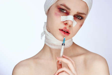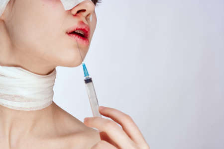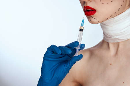 Beauty concept. Young model with blue lips and soft skin doing plastic surgery. Female with bandage on head, on light background. Doctor in black latex gloves making beautician injections with syringe