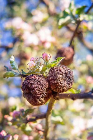 Two old rotten apples on the branch with blossoms in spring. Close up.