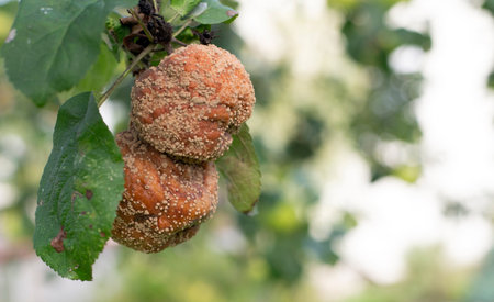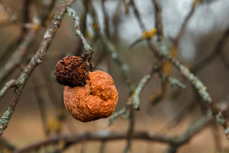 The fruits of the apple tree are affected by fungus and rot. Loss of apple harvest.