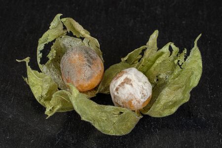 three peaches whose surface is covered with mold and started to rot, close-up of spoiled natural food in a white plate on a black background