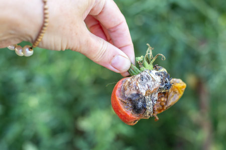 Tomato diseases. A gardener holds a blackened, rotten tomato affected by late blight. Prevention of fungal diseases in vegetable growing.