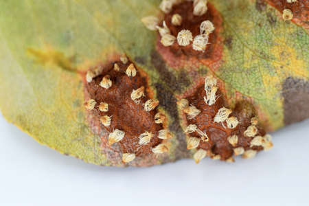 Pear leaf (underside) with Pear rust - disease caused by Gymnosporangium sabinae fungus, close up view