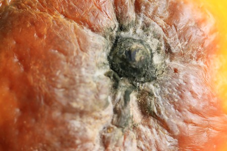 Rotten spoiled pomegranate, close-up. Ugly moldy fruit. Side view, selective focus. Improper food storage. Concept - reduction of organic waste.