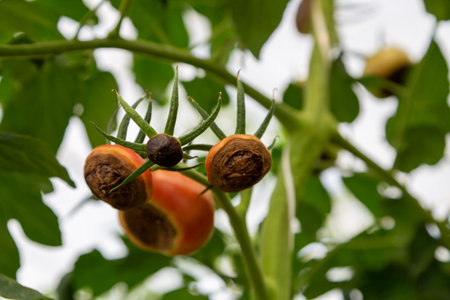 Still green, unripe, young tomato fruits affected by blossom end rot. This physiological disorder in tomato, caused by calcium deficiency.