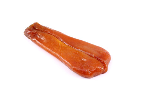 Whole piece of Bottarga, italian gastronomic specialty. It is made of salted, cured fish roe of gray mullet or bluefin tuna. White background.