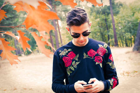 handsome beard man in autumn park posing on camera