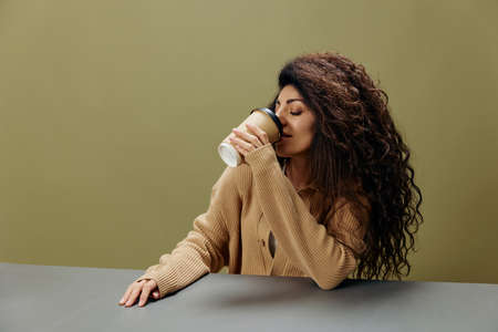 Happy tanned curly Latin female hold a cup to-go drink enjoy coffee sit at the table isolated over olive green background look at camera. Copy space Mockup Banner. Coffee lover offer