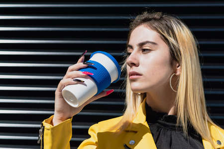 close up portrait of beautiful blonde hispanic latina girl, wearing yellow jacket, drinking coffee in the street on a sunny day, fashion concept.