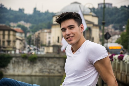 Handsome young man in city street, looking at camera with a smile