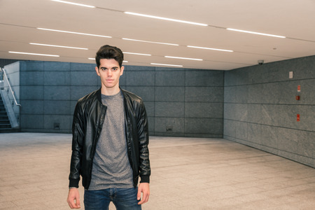 Beautiful young man with short hair posing in an urban context