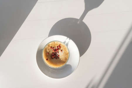 Aromatic tasty coffee drink at ceramic cup with shadows on white table background, copy space, top view, inspiration morning concept.