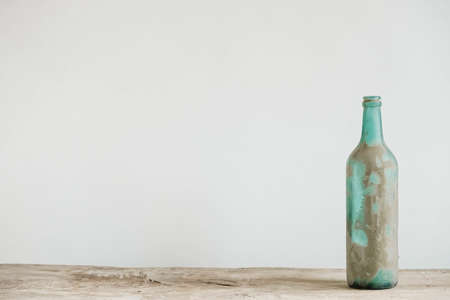 Empty glass bottle in pollen and dirt on a wooden table. Copy, empty space for text.
